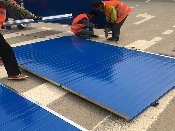 道路施工圍擋 泡沫夾心圍擋安裝 工人正在打螺絲
